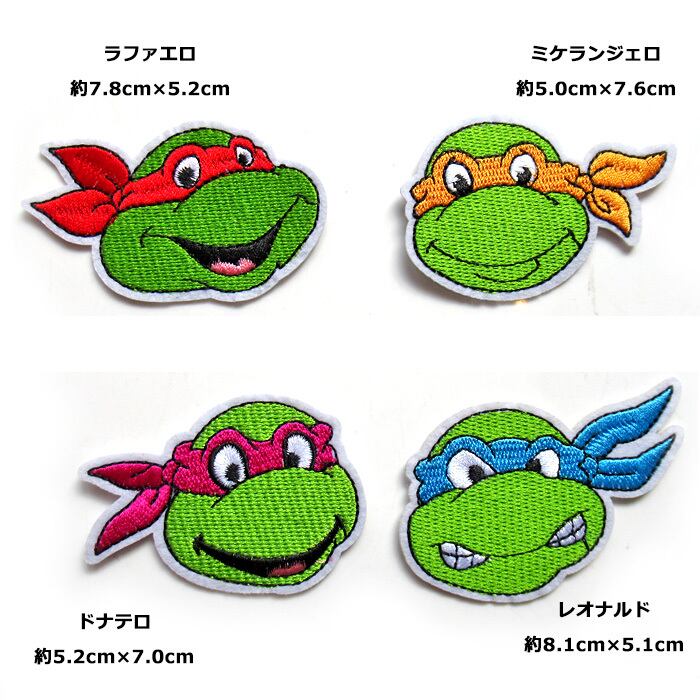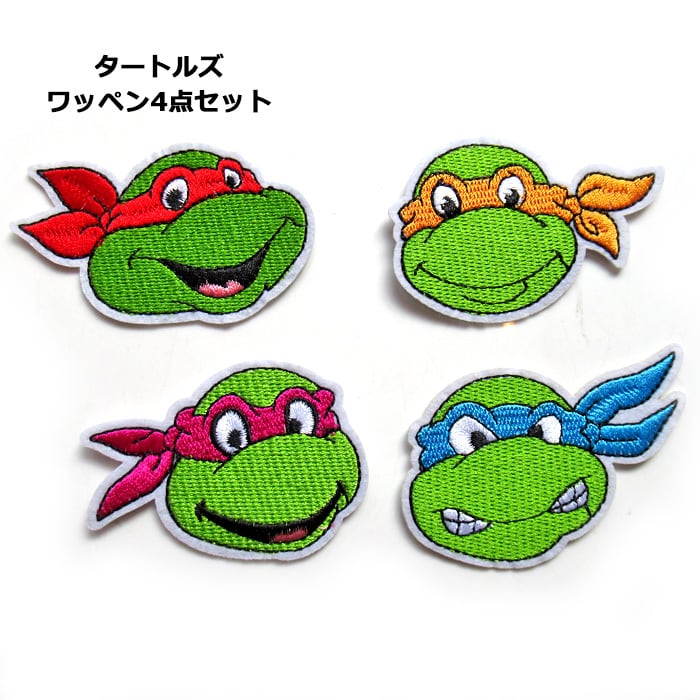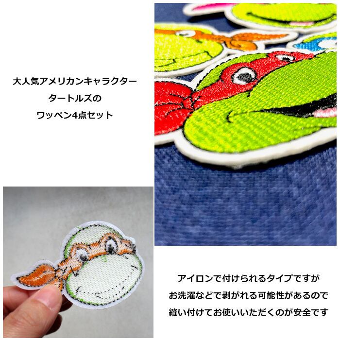 ワッペン/わっぺん/アップリケ/あっぷりけ/大人用/子供用/大人向け/子供向け/アイロン/手縫い/アイロンワッペン/刺繍ワッペン/キャラクターワッペン/アイロン接着/アイロンで付けられる/キャラクター/アメリカンキャラクター/アメキャラ/タートルズ/レオナルド/ラファエロ/ミケランジェロ/ドナテロ/4点セット/4枚セット/4個セット/セット売り/刺繍/手芸/補修/キャップ/帽子/パーカー/フーディ/トレーナー/給食袋/体操着/手提げ/お稽古バッグ/シンプル/おしゃれ/カジュアル/ポップ/カルチャー/レトロ/かわいい/かっこいい/プレゼント/誕生日/クリスマス/お祝い/入園/卒園/入学/卒業/新生活/海外雑貨/アメリカン雑貨/アメ雑/ダブルスリー