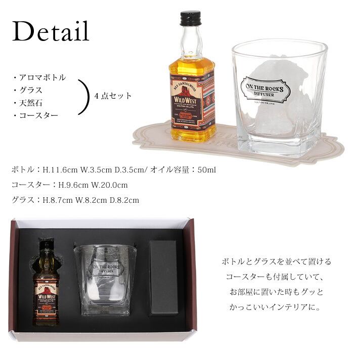 ウイスキーのミニチュアボトルとロックグラスを模した大人の遊び心たっぷりなディフューザーセット。